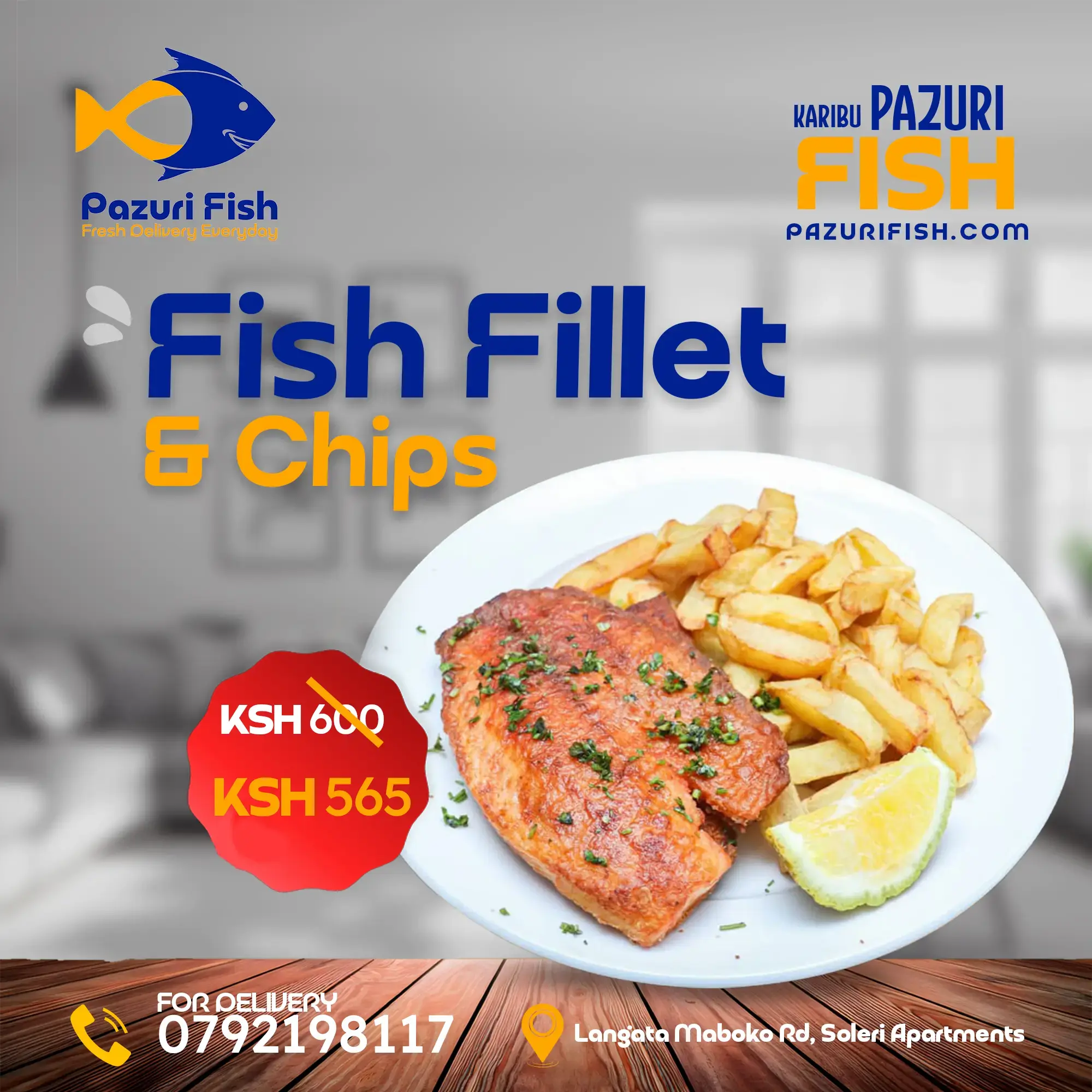 250 grams Nile Perch Fish Fillet, Medium Fries with Pazuri Fish special sauce.
